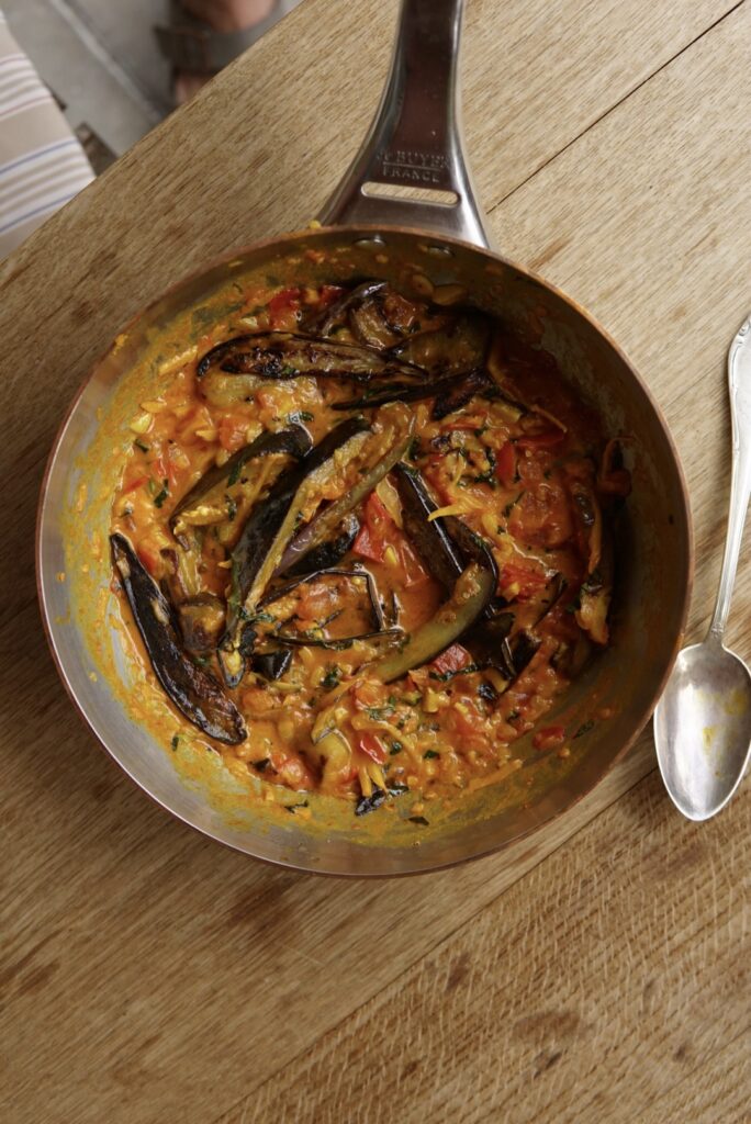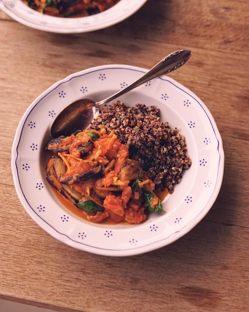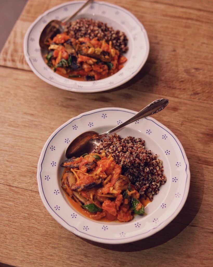 P.S.: Wir haben dieses Rezept auch schon mit Dosentomaten gekocht, aber die Textur der Sauce wird komplett anders und sie verliert die Leichtigkeit, die wir an diesem Gericht so lieben. Da es sich mit den Auberginen sowieso um ein Sommergericht handelt, würden wir also empfehlen, in diesem Fall auf Dosentomaten zu verzichten und dieses Gericht mit frischen Tomaten und Auberginen zuzubereiten, wenn diese wirklich Saison haben (in der Schweiz von ca. Mai bis Oktober).