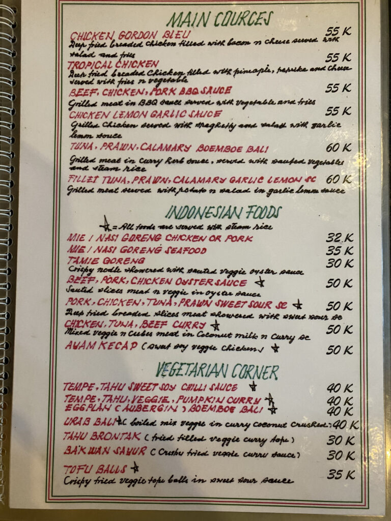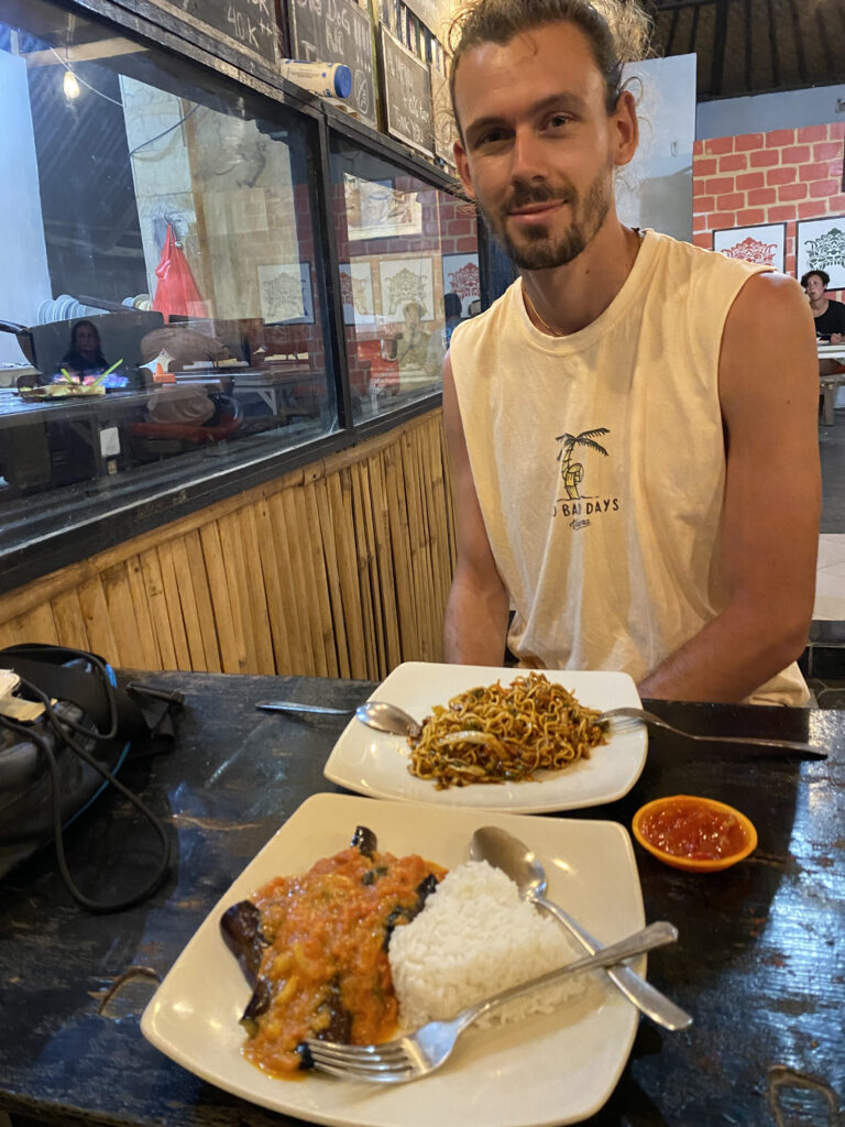 Es handelt sich dabei evt. um eine Abwandlung des bekannteren Gerichts «Terong Balado», bei welchem Auberginen in einer scharfen Chilisauce (Sambal) gekocht werden. Jedoch war dieses Gericht viel milder und erinnerte uns fast ein wenig an eine klassische italienische Tomatensauce mit Auberginen. Die mitgekochte Kokosmilch, der Kurkuma, die Ingwerstäbchen und der Thai-Basilikum gaben ihm aber einen unverfälschlich balinesischen Twist und machten es zu einem der Gerichte, die uns auf dieser Reise sehr positiv überraschten und entsprechend in Erinnerung blieben!