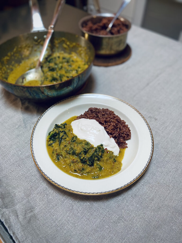 Nur noch ca. 5 min köcheln lassen und dann mit Reis (wir lieben es mit rotem Reis mit Rosinen) & etwas Naturejoghurt (alternativ auch Kokos- oder Sojajoghurt) servieren.