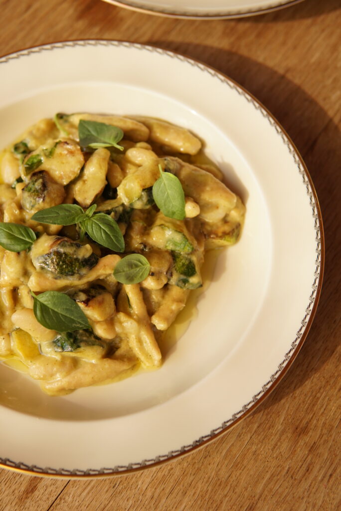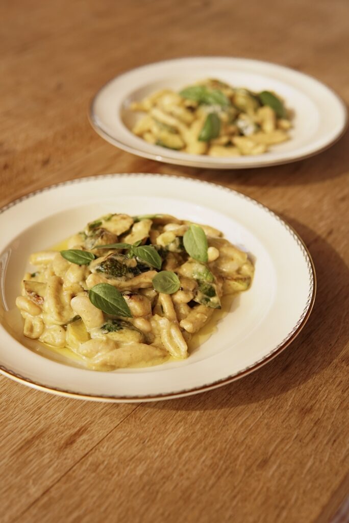Zum Abschluss die Zucchini-Sauce, die gekochte Pasta, die gekochten Butterbohnen, den Käse und den gezupften Basilikum beigeben. Das Ganze gut mischen und unter rühren kurz fertigkochen, bis die Sauce etwas eingedickt ist.