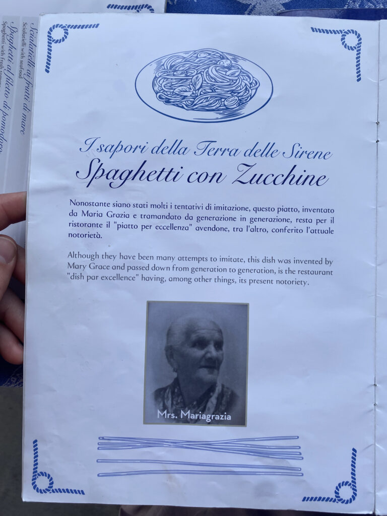 Wir sind auf einer Reise durch Süditalien zum ersten Mal damit in berührung gekommen und haben schlussendlich in Nerano selber sogar das Restaurant namens «Maria Grazia» gefunden, in welchem das Gericht angeblich erfunden worden sein soll.