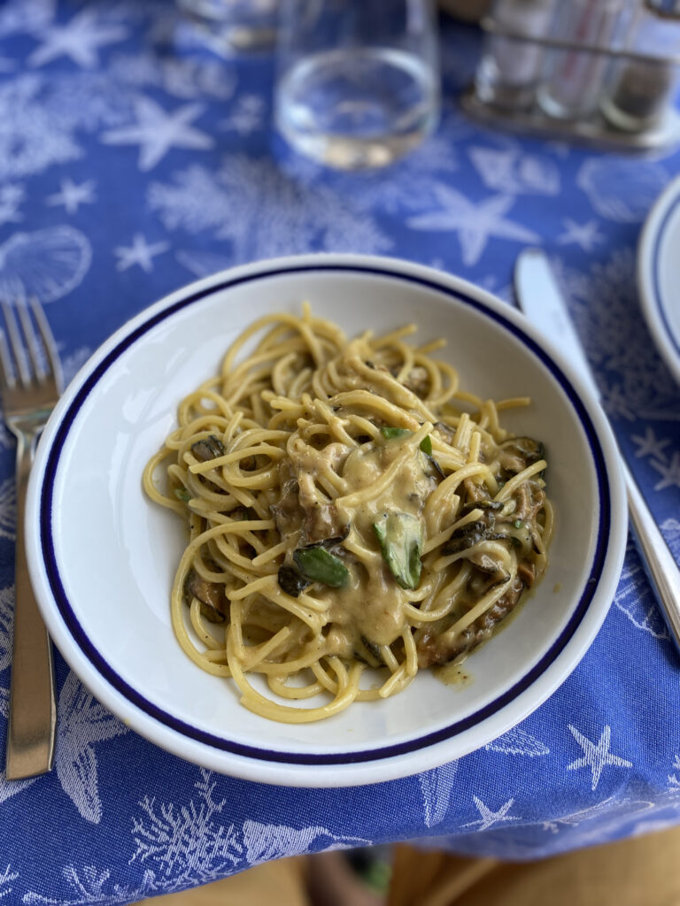 Wir haben uns sofort in die Pasta verliebt, weil es wieder einmal ein tolles Beispiel dafür war, wie ein so einfaches, vegetarischesGericht aus der «Cucina Povera» regionale Berühmtheit erlangen kann. Wir haben während unserer Reise an vielen Orten unterschiedliche Interpretationen der Pasta alla Nerano gegessen (und nebenbei auch die eine oder andere Pizza alla Nerano 😛 ), aber so cremig und geschmacksintensiv wie bei Maria Grazia waren sie sonst nirgends.