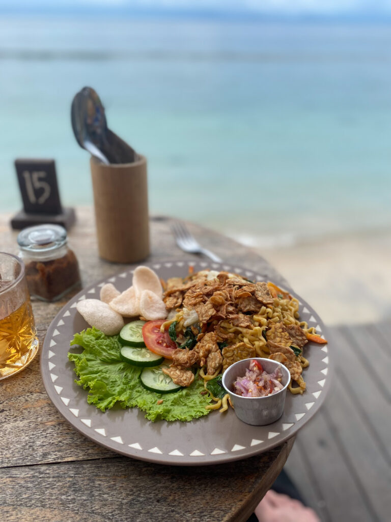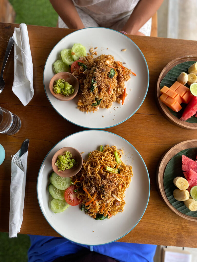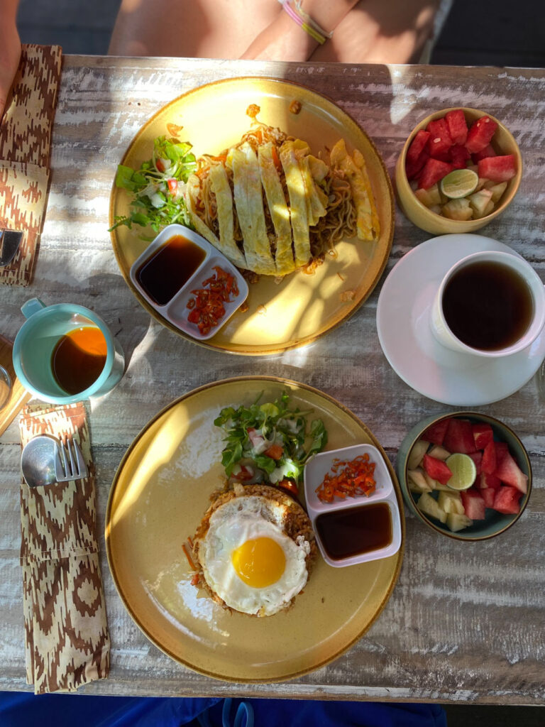 Da Bali aber durch den Tourismus sehr international geworden ist und aufgrund der entstandenen Surfer- & Yoga-Szene auch eine grössere Nachfrage nach vegetarischen & veganen Alternativen entstanden ist, haben sich viele Restaurants angepasst. Entsprechend fanden wir in fast jedem Restaurant eine Variante von Nasi oder Mie Goreng, welche mit Tofu oder Tempeh anstelle von Fleisch zubereitet wurde. Und zu unserer grossen Freude waren diese vegetarischen Varianten auch meistens sehr lecker. Durch die würzige Sauce kriegen diese «Stir-fries» eine geschmackliche Tiefe & Komplexität, dank welcher man Fleisch unserer Meinung nach getrost weglassen kann, ohne etwas zu vermissen. Entsprechend haben wir sowohl Nasi (Gebbis Favorit) als auch Mie Goreng (Niggis Favorit) sehr oft auch schon morgens zum Frühstück gegessen, so wie dies viele Balines*innen traditionell tun. 🙂