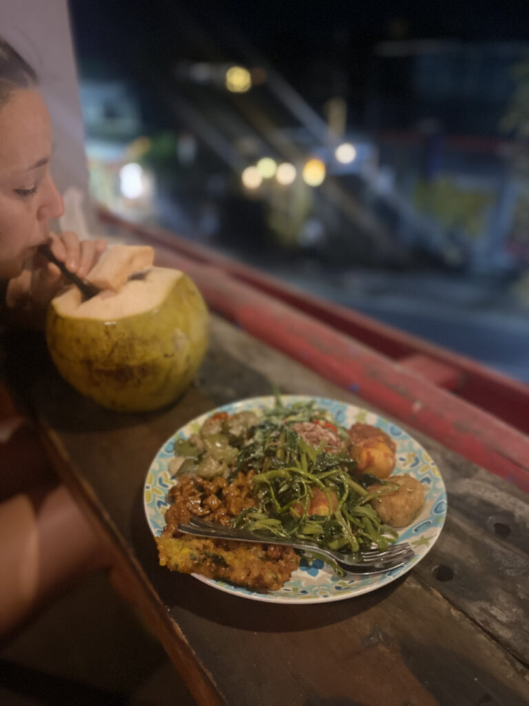 Was uns dafür umso mehr & unerwartet positiv überrascht hat und zu einem der Highlights unserer Reise geworden ist, war «Nasi Campur» (übersetzt «gemischter Reis»). Dabei handelt es sich um ein Gericht, bei welchem eine Vielzahl verschiedener Komponenten mit Reis zu einem grossen Ganzen kombiniert werden. Als wir zuerst davon hörten & auch als wir es die ersten Male probierten, waren wir noch nicht sehr begeistert, da es in den meisten «Warungs» (so heissen die lokelen Restaurants in Bali) als eines von vielen Gerichten auf der Speisekarte angepriesen wurde. Dann war die Zusammensetzung meist nicht überwältigend & vielfältig. Irgendwann stiessen wir aber auf einen Warung in Canggu, der sich voll auf Nasi Campur spezialisiert hatte & dieses als eine Art Buffet servierte. In der dreistöckigen Vitrine waren unzählige Gerichte ausgestellt, von denen der grösste Anteil vegetarisch, resp. sogar vegan war. Beim ersten Mal Bestellen waren wir noch etwas verwirrt, merkten dann aber nach einigen Minuten zuschauen (das Restaurant war gedrungen voll, sowohl mit Locals als auch Touristen) schnell, dass wir zuerst angeben mussten, ob wir als Basis gerne normalen, braunen oder gelben (mit Kurkuma) Reis hätten. Danach konnten wir einfach auf die jeweils gewünschten Komponenten (von welchen wir natürlich keine Namen kannten) in der Vitrine zeigen und es wurde uns so unser persönliches Festmahl zusammengestellt. Der Preis errechnete sich dabei meist aus der Anzahl Komponenten & der gesamten Menge (umgerechnet zahlten wir nie mehr als 2 Fr. für einen Teller, von dem wir beide satt wurden).